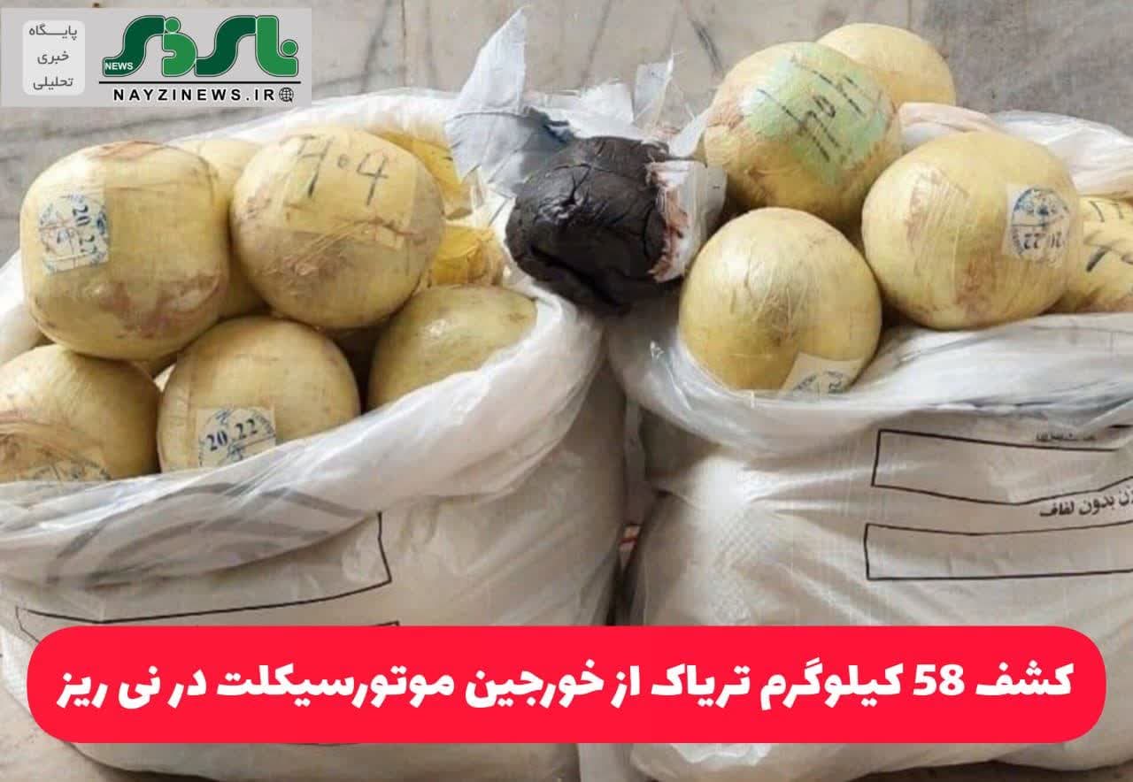 فرمانده انتظامی نیریز گفت: در بازرسی از خورجین یک دستگاه موتورسیکلت، 58 کیلوگرم تریاک و یک قبضه اسلحه کلت کشف شد.