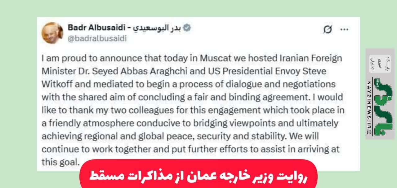 وزیر خارجه عمان در شبکه ایکس نوشت: باعث افتخار من است که امروز در مسقط میزبان دکتر سید عباس عراقچی، وزیر امور خارجه ایران، و استیو ویتکاف، فرستاده ویژه رئیسجمهور آمریکا بودیم و میانجیگری برای آغاز روند گفتوگو و مذاکرات را با هدف مشترک دستیابی به توافقی عادلانه و الزامآور انجام دادیم.