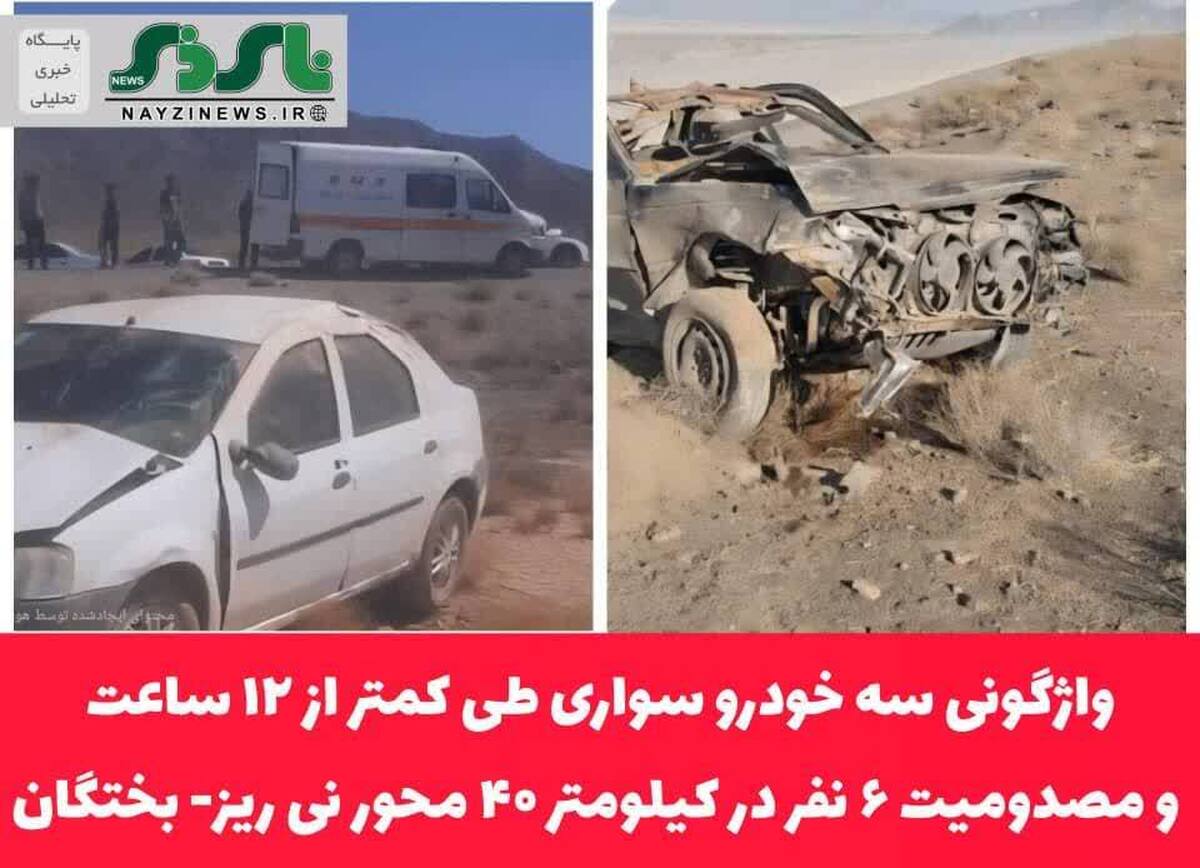 به گزارش روابط عمومی اورژانس پیش بیمارستانی شهرستان نی‌ریز، محمد حسین کچویی مسئول اورژانس شهرستان گفت: در فاصله کمتر از ۱۲ ساعت وقوع سه حادثه واژگونی خودرو سواری در محور نی ریز - بختگان به مرکز ارتباطات اورژانس اعلام شد.