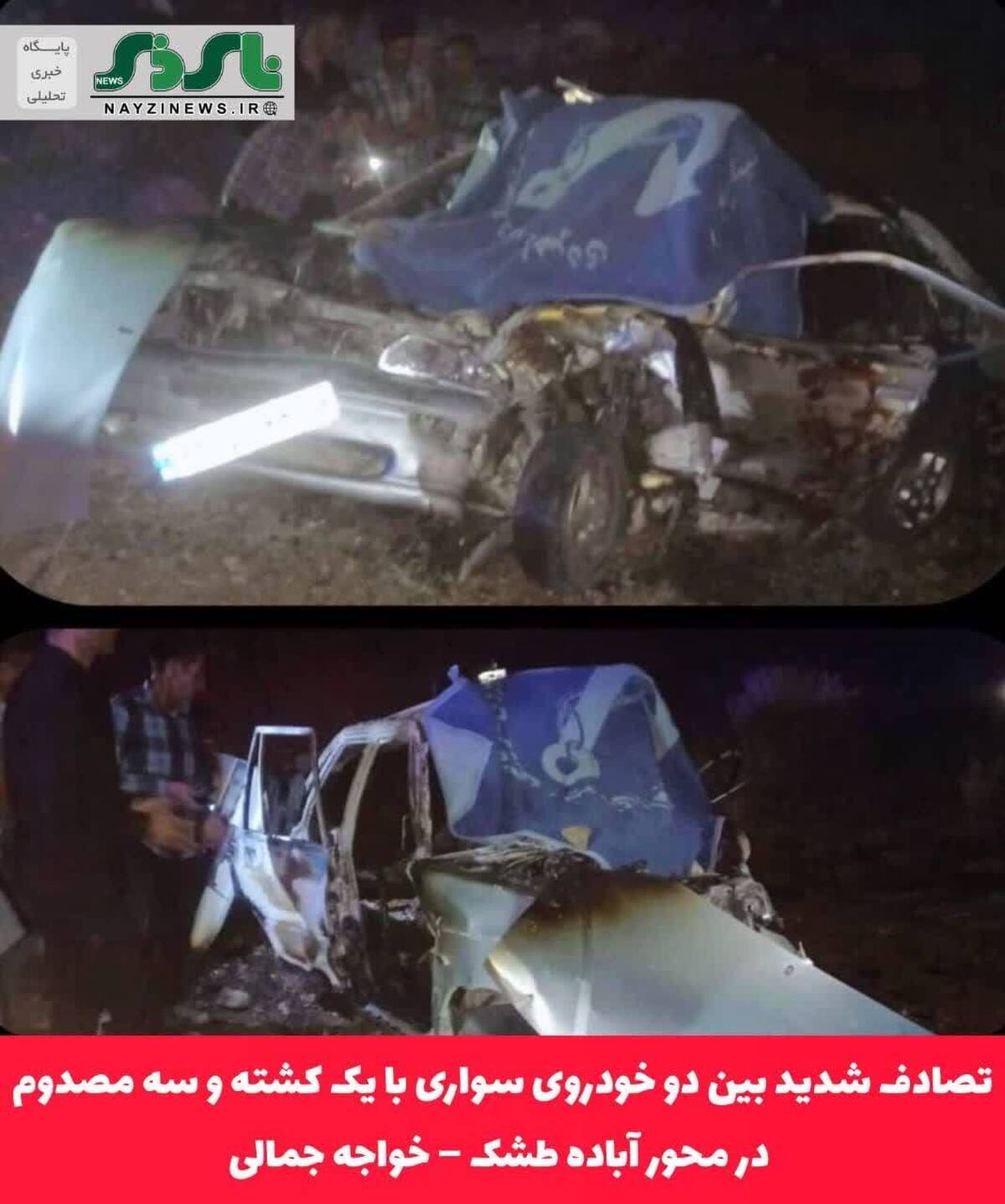 «محمد زارع» مسئول اورژانس ۱۱۵ شهرستان بختگان گفت ، در ساعت ۱۹ روز یکشنه ۱۳ مهر، وقوع سانحه رانندگی بین دو خودروی سواری پژو ۴۰۵ و پراید در محور آباده طشک به خواجه جمالی (محدوده پیچ بناب) به مرکز ارتباطات اورژانس گزارش شد. بلافاصله پس از دریافت گزارش، سه دستگاه آمبولانس از پایگاههای اورژانس شهرستان به محل حادثه اعزام شدند.