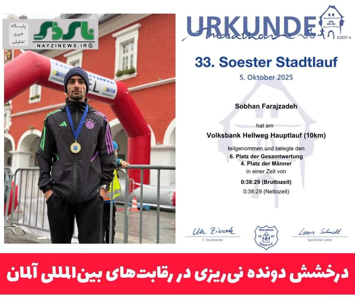 سبحان فرجزاده، دونده جوان و مستعد نیریزی، در مسابقات دوی ۱۰ کیلومتر شهر «زوست» آلمان موفق به کسب مقام ششم شد. این رقابتها که در یکی از مراکز اصلی ورزش و دویدن کشور آلمان برگزار شد، با حضور جمع زیادی از دوندگان حرفهای آلمانی و بینالمللی همراه بود.