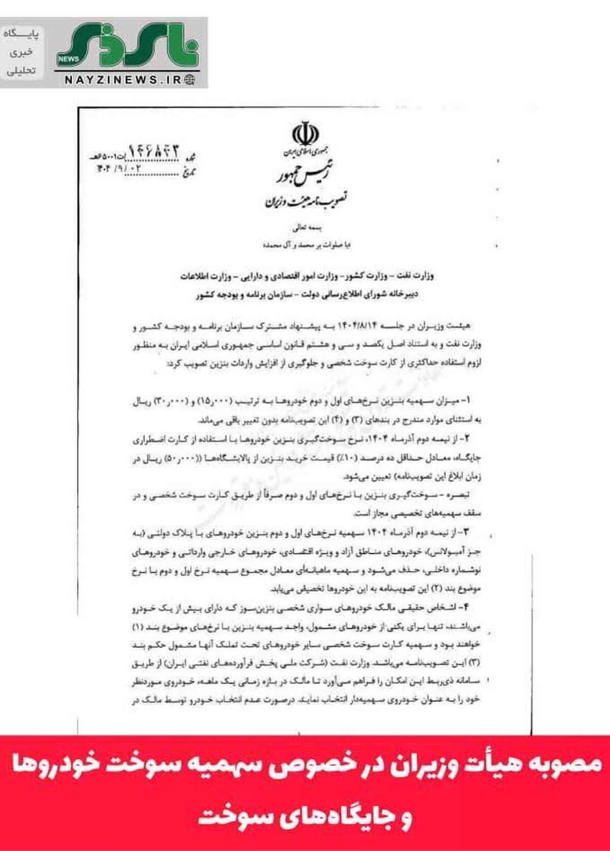 با تصویب هیأت وزیران سهمیه سوخت ۱۵۰۰ و ۳ هزار تومانی خودروهای نو شماره داخلی، خودروهای وارادتی و خودروهای مناطق آزاد حذف و این خودروها از نیمه آذر باید با نرخ ۵ هزار تومانی سوختگیری کنند
