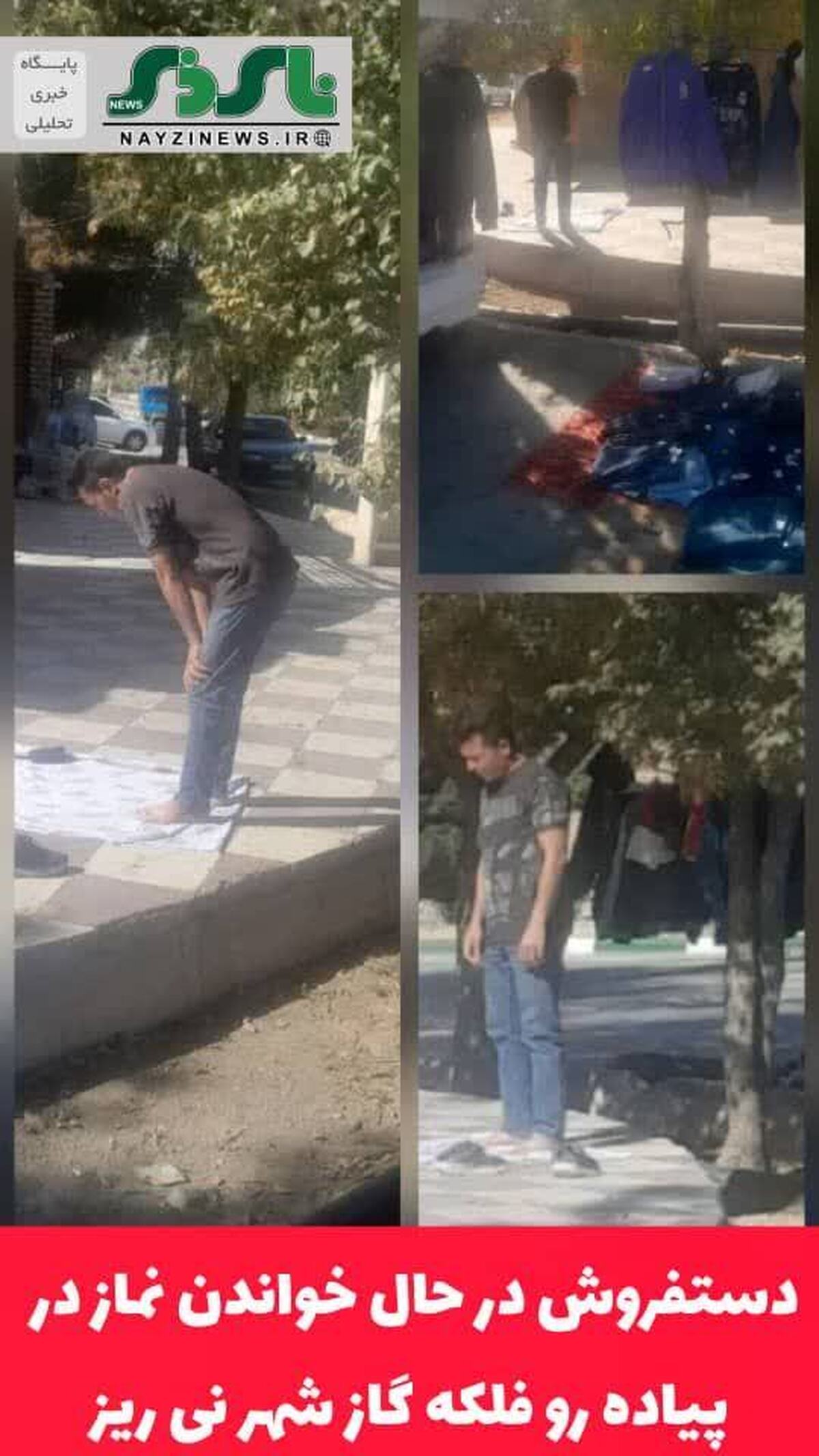 دستفروش در حال خواندن نماز در پیاده رو فلکه گاز شهر نی ریز