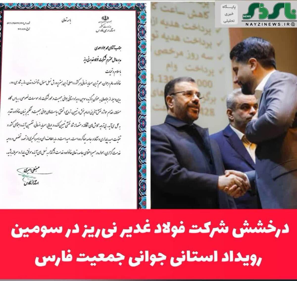 شرکت فولاد غدیر نی‌ریز به‌دلیل اجرای سیاست‌های اثربخش حمایتی از کارکنان و خانواده‌ها، به‌ویژه مادران شاغل، در سومین رویداد استانی جایزه جوانی جمعیت استان فارس به‌عنوان یکی از شرکت‌های برگزیده مورد تقدیر قرار گرفت.