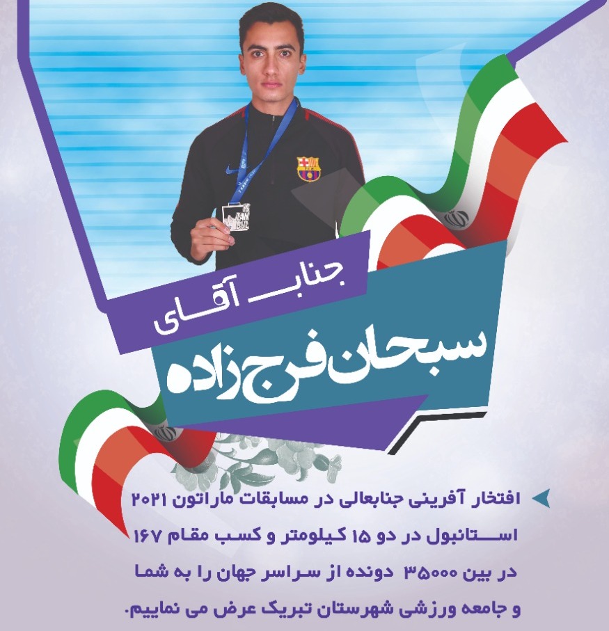 سبحان فرج زاده، دانشجوی کاردانی پیوسته رشته الکتروتکنیک دانشگاه آزاد اسلامی واحد نی ریز در مسابقات جهانی دوی ماراتن استانبول شرکت و افتخارآفرینی کرد.