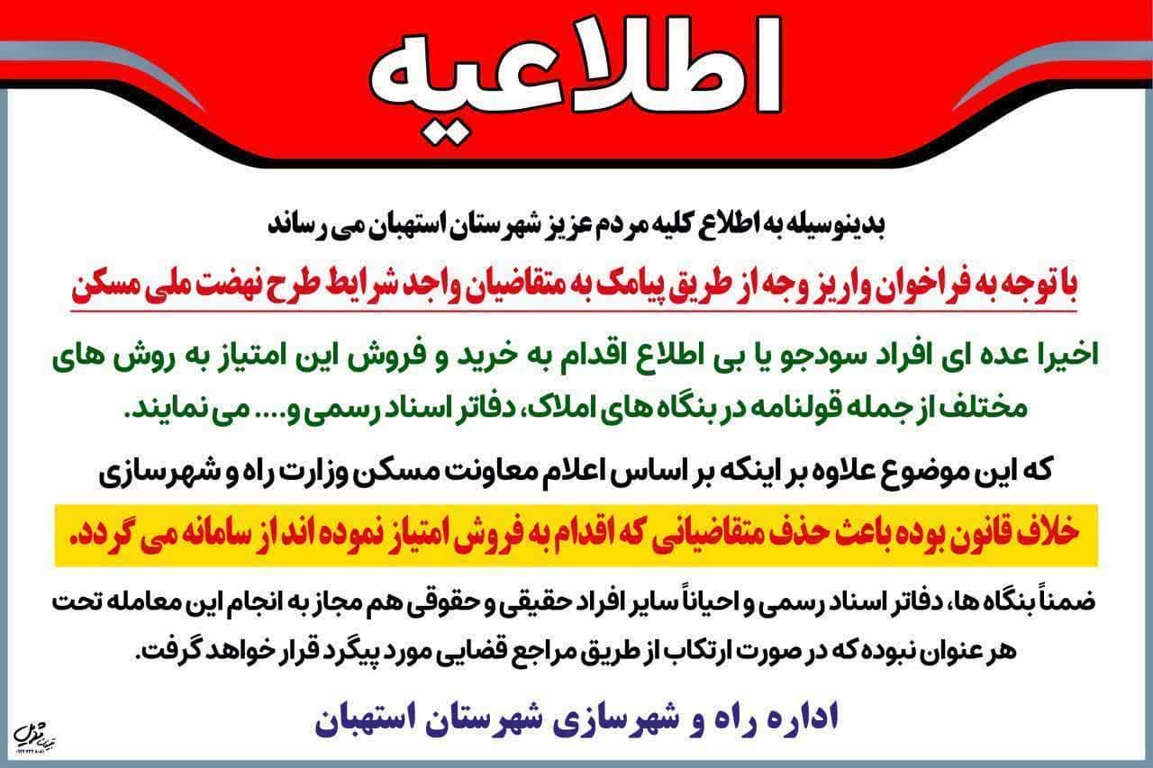 بدینوسیله به اطلاع کلیه مردم عزیز شهرستان استهبان میرساند با توجه به فراخوان واریز وجه از طریق پیامک به متقاضیان واجد شرایط طرح نهضت ملی مسکن، اخیرا عده ای افراد سودجو یا بی اطلاع اقدام به خرید و فروش این امتیاز به روشهای مختلف از جمله قولنامه در بنگاه های املاک، دفاتر اسناد رسمی و.... می نمایند که این موضوع علاوه بر اینکه خلاف قانون بوده باعث حذف متقاضیانی که اقدام به فروش امتیاز نموده اند از سامانه می گردد. ضمنا بنگاه ها، دفاتر اسناد رسمی و احیانا سایر افراد حقیقی و حقوقی هم مجاز به انجام این معامله تحت هر عنوان نبوده که در صورت ارتکاب از طریق مراجع قضایی مورد پیگرد قرار خواهد گرفت.